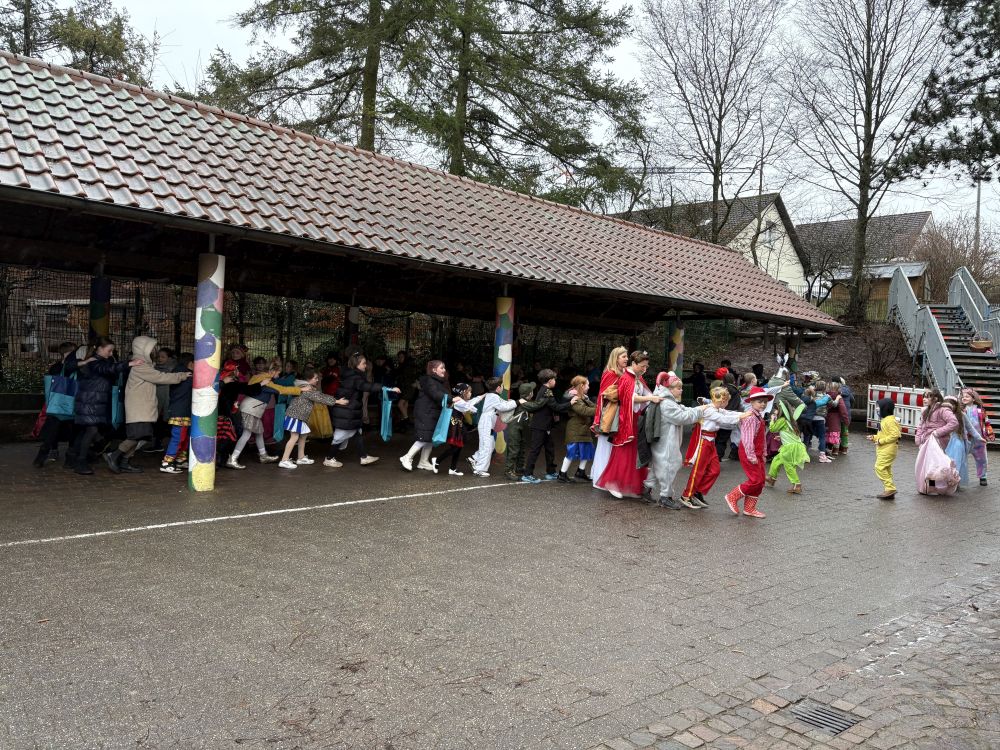 Der Höhepunkt der Feier war der Besuch des Prinzessinnenpaars des KVK, begleitet vom Dreigestirn. Mit funkelnden Kostümen und einem herzlichen Empfang betraten sie die Treppe auf dem Pausenhof. Im Anschluss an die kleine Rede der Gäste durfte das Dreigestirn Süßigkeiten werfen – eine Tradition, die bei den Jüngsten große Freude hervorrief. Musikalisch ging es ebenfalls rund. Es wurden die Lieder „Rakete“ und „Oben unten gute Laune“ angestimmt, während die Schülerinnen und Schüler sangen und fröhlich dazu tanzten. Die mitreißenden Rhythmen luden zu Bewegung ein, und der Schulhof verwandelte sich kurzzeitig in eine tanzende Spielwiese.