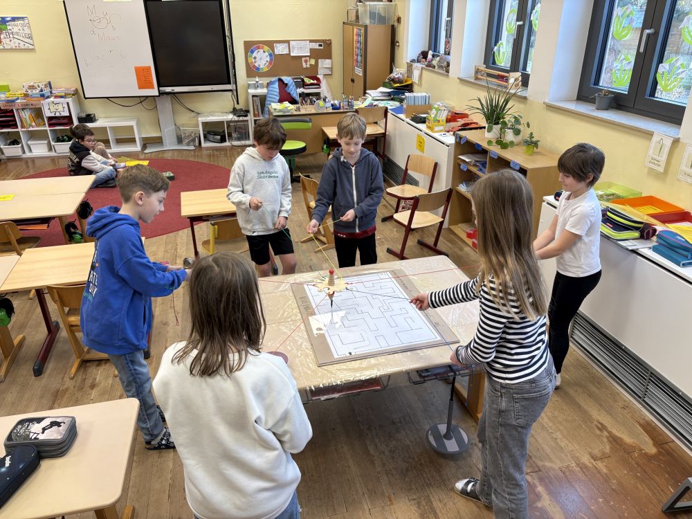 Ein besonders beliebtes Spiel war der „Strippenzieher“. Hier mussten mehrere Kinder gemeinsam einen Stift mit Seilen führen und einen Weg durch ein Labyrinth zeichnen – und das ganz ohne zu sprechen! Das war gar nicht so einfach und machte allen viel Spaß.